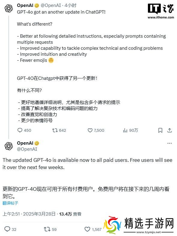 本站 3 月 28 日消息,OpenAI 今日发布公告,宣布为 ChatGPT 中的GPT-4o 带来了一些功能上的更新,并确认升级版GPT-4o 已面向所有付费用户开放,而免费用户还要再等几周。