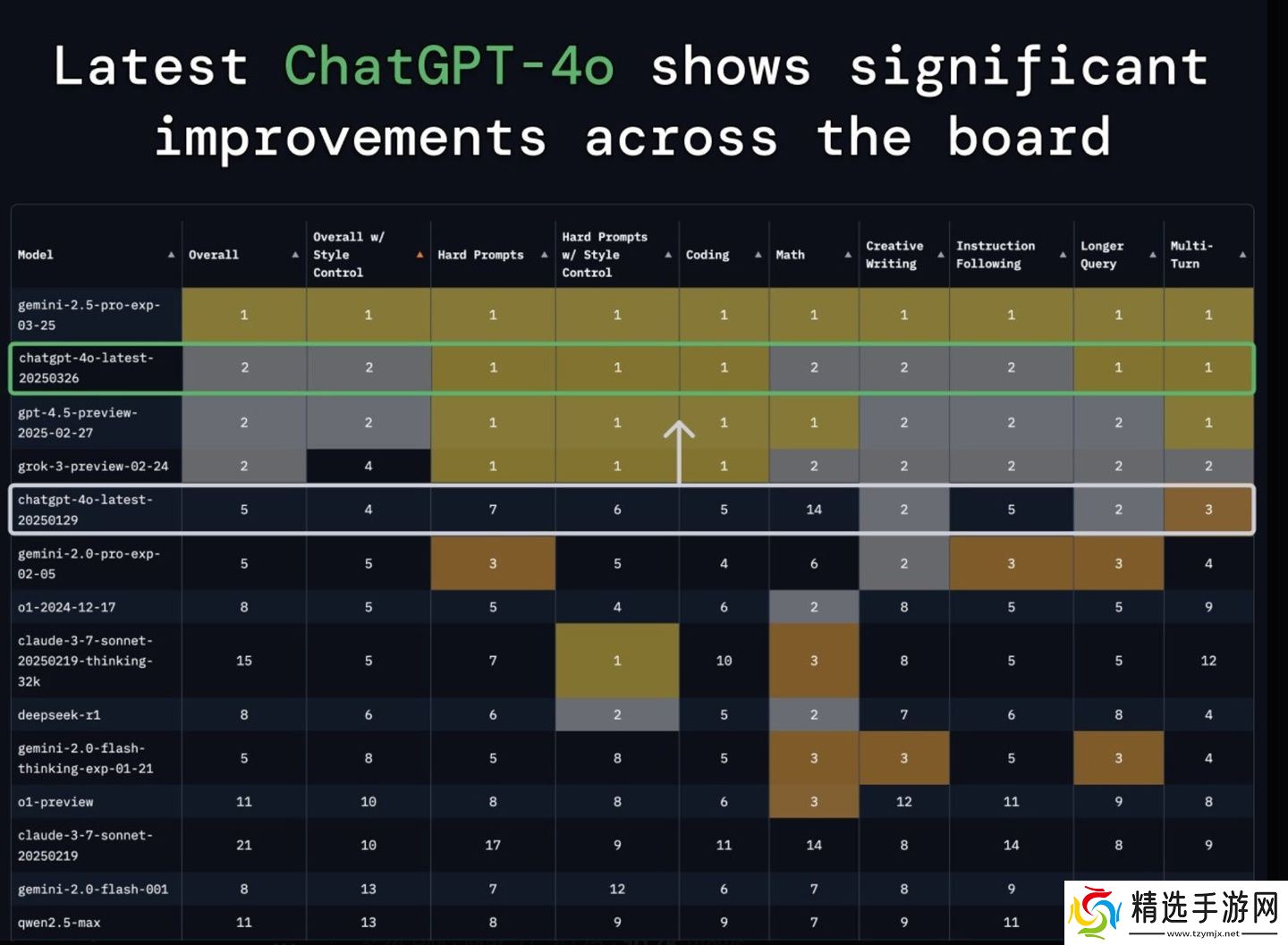 在 LMArena 众包 AI 基准测试网站上,最新的 ChatGPT GPT-4o(2025-03-26)模型已经提升到了第二名的位置,甚至超过了其上个月推出的 GPT-4.5。与 2025-01-29 那次测试成绩相比,此次更新后成绩足足提高了 30 分。