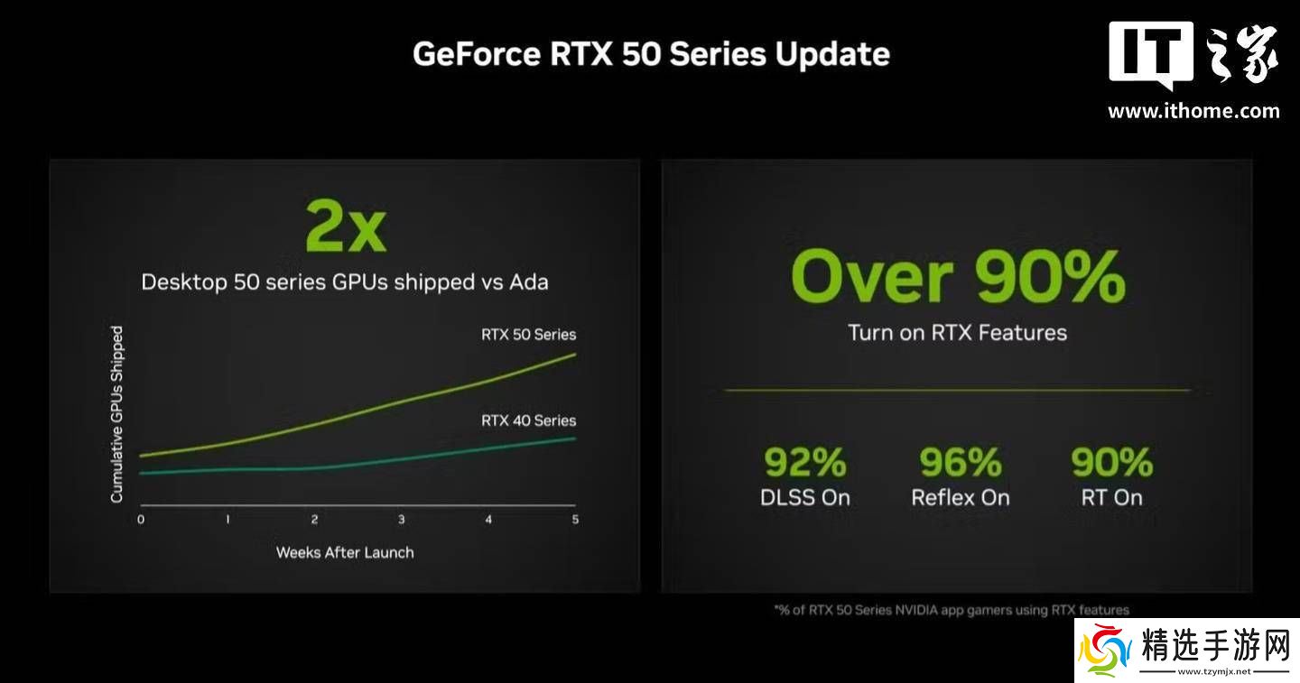 在英伟达于本年度游戏开发者大会(GDC)上发布的媒体简报中,透露了一些有关显卡市场的关键信息。英伟达宣称,其最新推出的RTX 50系列显卡在上市前五周的出货量,相比同期的RTX 40系列实现了翻倍。然而,这一数据背后隐藏着一些细节:RTX 50系列在发售的前五周内推出了四款显卡,包括RTX 5090、RTX 5080、RTX 5070 Ti和RTX 5070,相比之下,RTX 40系列在同一时期仅推出了RTX 4090和RTX 4080两款,且售价均超过1200美元。因此,RTX 50系列显卡出货量的增长,部分得益于更多型号的推出以及相对更为亲民的价格策略。