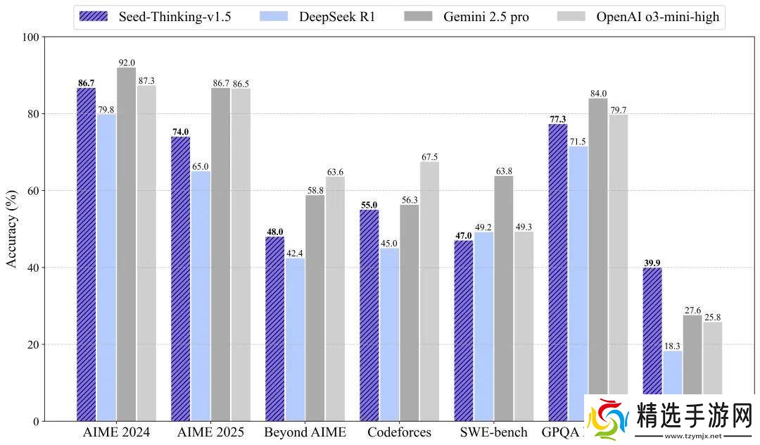 Seed-Thinking-v1.5模型在多个领域展现出了卓越的性能。在数学推理方面,它在AIME 2024竞赛中取得了86.7的高分,与OpenAI的o3-mini-high模型不相上下。在编程竞赛中,该模型在Codeforces平台上的通过率达到了55.0%,接近Gemini 2.5 Pro的水平。在科学推理任务上,Seed-Thinking-v1.5也取得了77.3%的优异成绩,同样接近业界领先模型。而在通用任务中,人类评估显示其表现超过了DeepSeek R1达8%,能够覆盖多种场景需求。