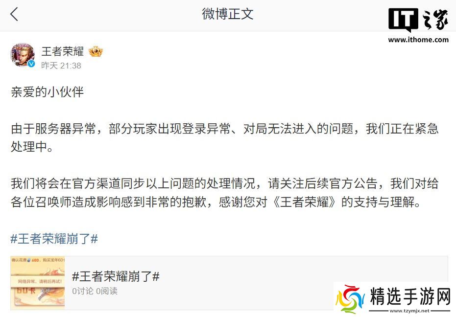 昨晚 9:38,《王者荣耀》官方发布公告,由于服务器异常,部分玩家出现登录异常、对局无法进入的问题,正在紧急处理中。