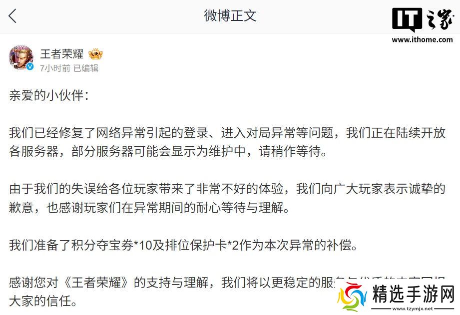 感谢您对《王者荣耀》的支持与理解,我们将以更稳定的服务与优质的内容回报大家的信任。