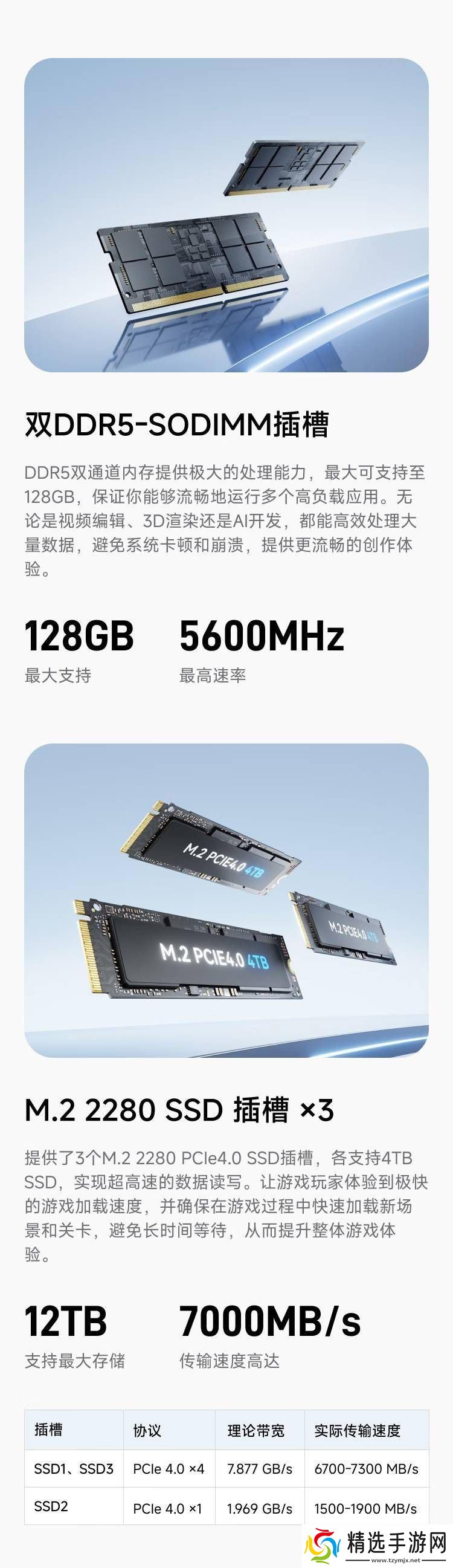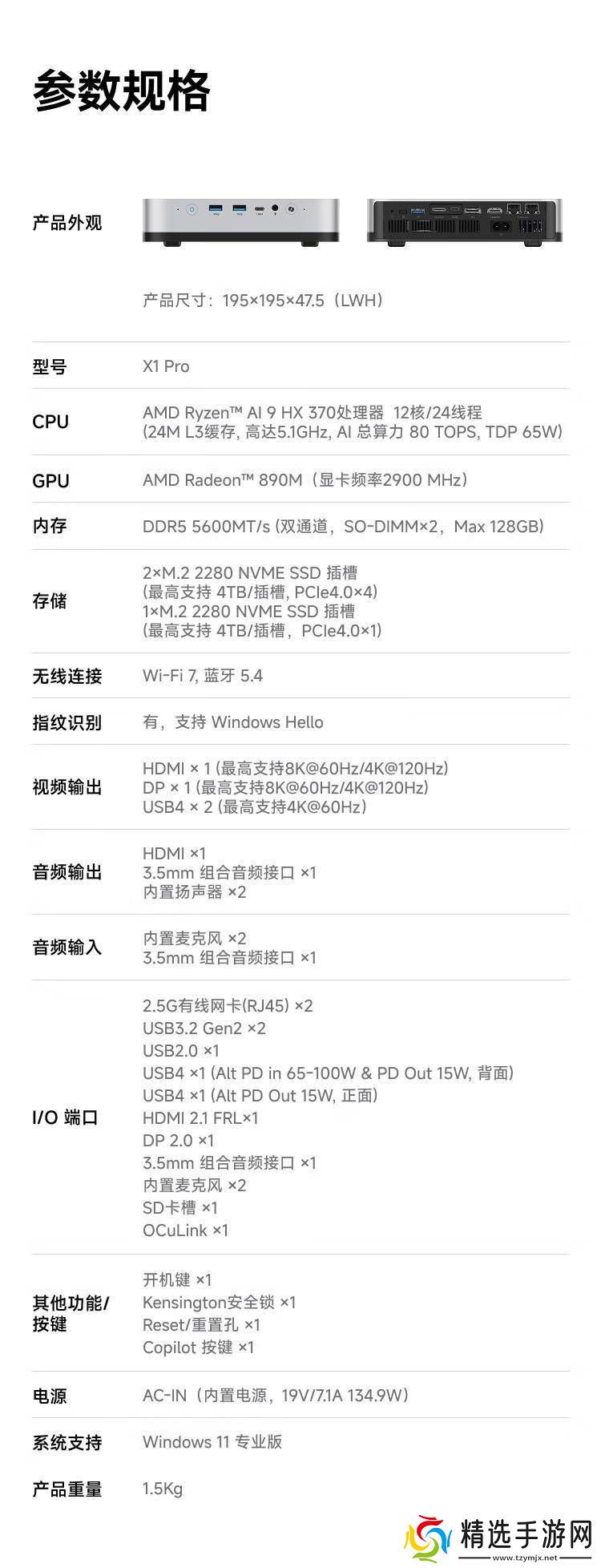 AI X1 PRO迷你主机的设计紧凑而高效,内置电源设计大大节省了空间。其尺寸为195×195×47.5毫米,小巧便携,非常适合需要高性能又追求空间利用率的用户。主机内部配备了双SO-DIMM内存插槽,以及三个PCIe 4.0 M.2盘位(其中两个为×4规格,一个为×1规格),为用户提供了充足的扩展空间。AI X1 PRO还搭载了支持Wi-Fi 7和BT 5.4的无线网卡,确保网络连接的高速和稳定。