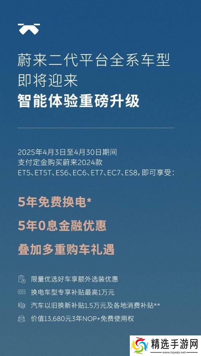 蔚来还推出了一系列购车优惠政策,以吸引更多消费者。在2025年4月3日至4月30日期间,支付定金购买蔚来2024款ET5、ET5T、ES6、EC6、ET7、EC7、ES8等车型的消费者,将可享受240张免费换电券以及5年0息的金融优惠等多重购车礼遇。这些政策无疑为蔚来汽车的销量增长注入了新的动力。
