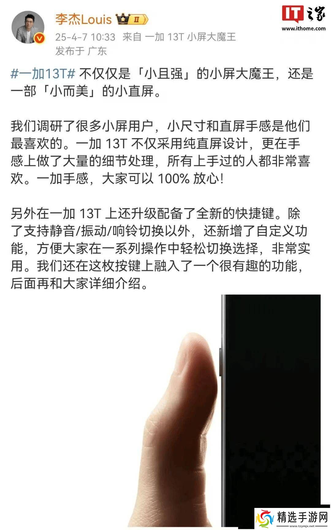 近日,微博上一则关于一加新机型13T的消息引起了广泛关注。一位知名博主于4月14日分享了该机的真机外观图片,首次向公众展示了这款备受期待的新机。