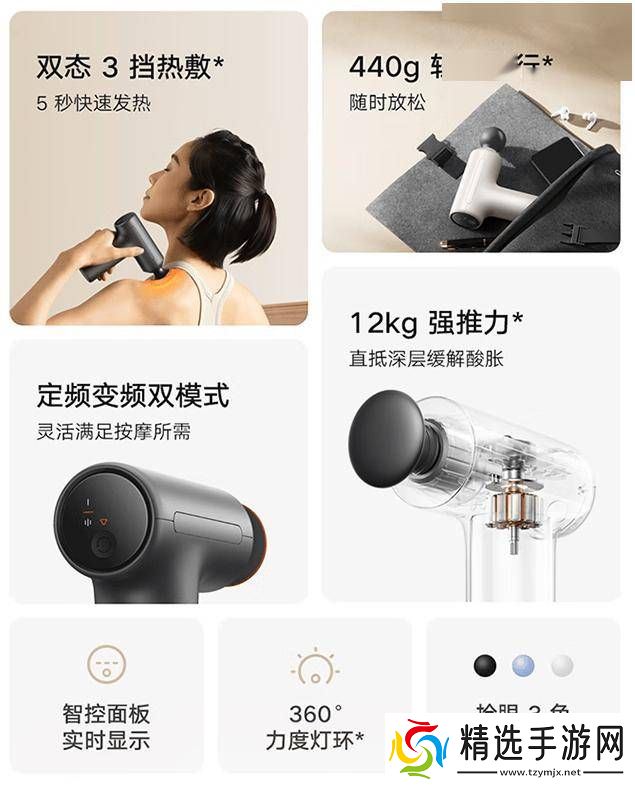 在性能方面,热敷筋膜枪H3迷你版搭载了定制款无刷电机,提供高达12kg的强劲动力,能深入6mm以下的深层筋膜进行按摩。产品还配备了三款专业按摩头:热敷平头、球形头和U形头,满足多样化的按摩需求。