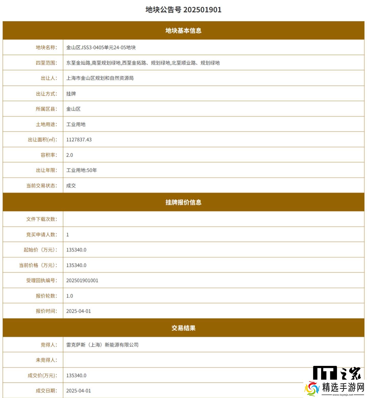 本站 4 月 15 日消息,上海土地交易市场显示,雷克萨斯(上海)新能源有限公司于 4 月 1 日竞得上海市金山区一宗工业用地,该地块占地约 112.78 万平方米,容积率 2,成交价 13.53 亿元。