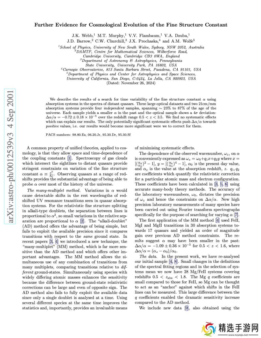 然而,这种巨大的变化并不仅仅停留在理论层面。实际上,一些科学观测和实验结果暗示了光速可能并非恒定不变。2001年,澳大利亚的一组研究团队通过对类星体光谱的观测,发现精细结构常数在宇宙历史上可能发生过变化,这一结果在统计上具有高度的置信度。这一发现挑战了光速恒定不变的观念,引发了科学界的广泛讨论。