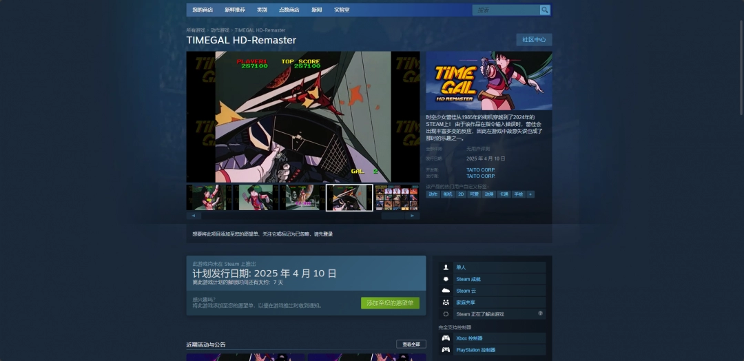 《TIMEGAL HD-Remaster》是Taito于1985年发行的激光影碟动画游戏第三部移植Steam的HD重制版。而这款游戏想要下载还是比较麻烦的,下载的第一步就是安装Steam平台,然后注册账号登录,并且搜索“TIMEGAL HD-Remaster”,然后点击购买,之后点马上开玩即可。