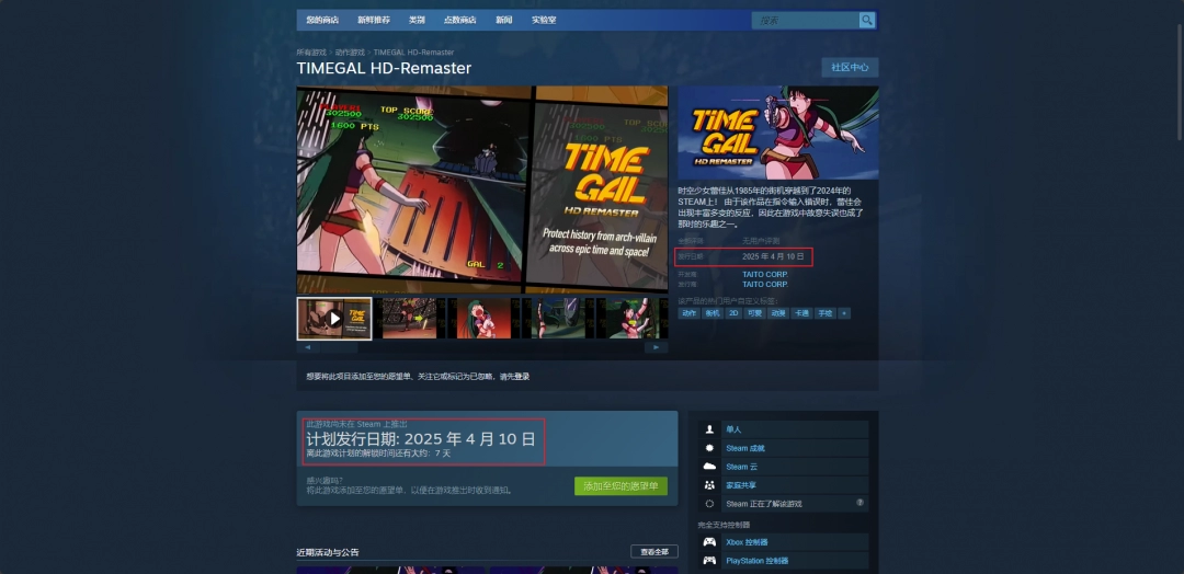 《TIMEGAL HD-Remaster》是Taito于1985年发行的激光影碟动画游戏第三部移植Steam的HD重制版。而这款游戏的发售时间就是2025 年 4 月 10 日,游戏预载时间大概是前一天,到时候注意一下即可。