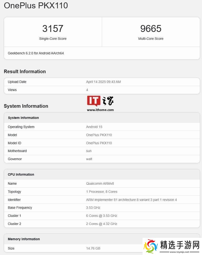 事实上,这并非一加13T手机首次曝光。此前,它已经在GSMA IMEI数据库中现身,型号为“PKX110”。而最新的跑分数据不仅再次确认了其强大的硬件配置,还揭示了它将搭载Adreno 830 GPU,并运行安卓15系统,为用户带来更加流畅的使用体验。