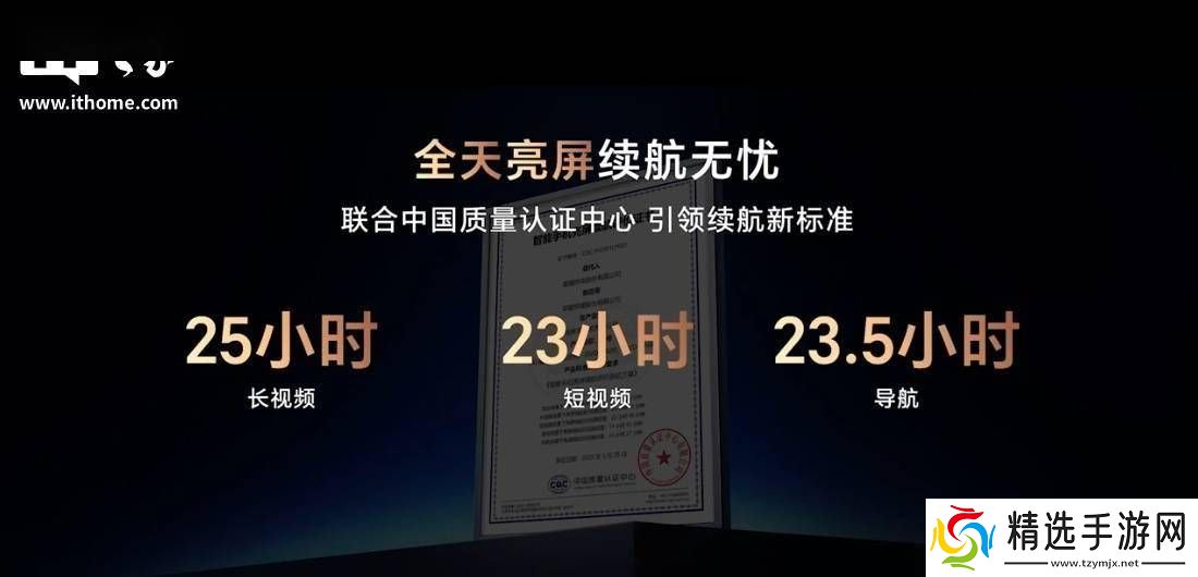 在续航表现方面,荣耀Power手机通过了中国质量认证中心的认证,宣称可实现全天亮屏续航无忧。具体来说,它能够支持25小时长视频播放、23小时短视频播放以及23.5小时导航,满足了用户在各种场景下的续航需求。