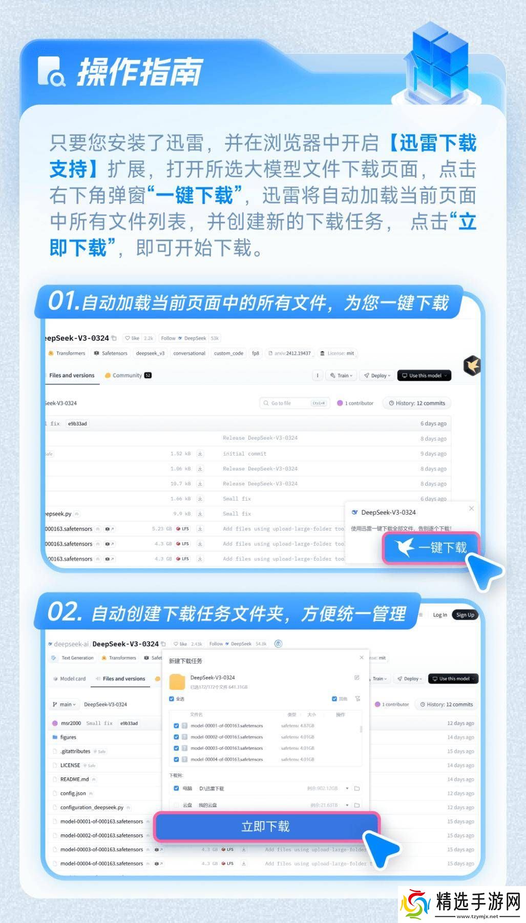 具体使用步骤如下:用户首先需要在浏览器中打开迅雷插件,并输入需要下载的大型模型文件的链接。随后,插件会自动识别并列出所有相关文件,用户只需一键点击即可开始批量下载。在下载过程中,用户可以清晰地看到每个文件的下载进度和速度。