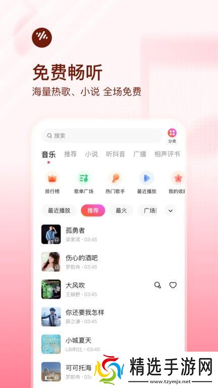 3、【免费畅听】大量热门歌曲、小说、相声评书免费,想听的都有。