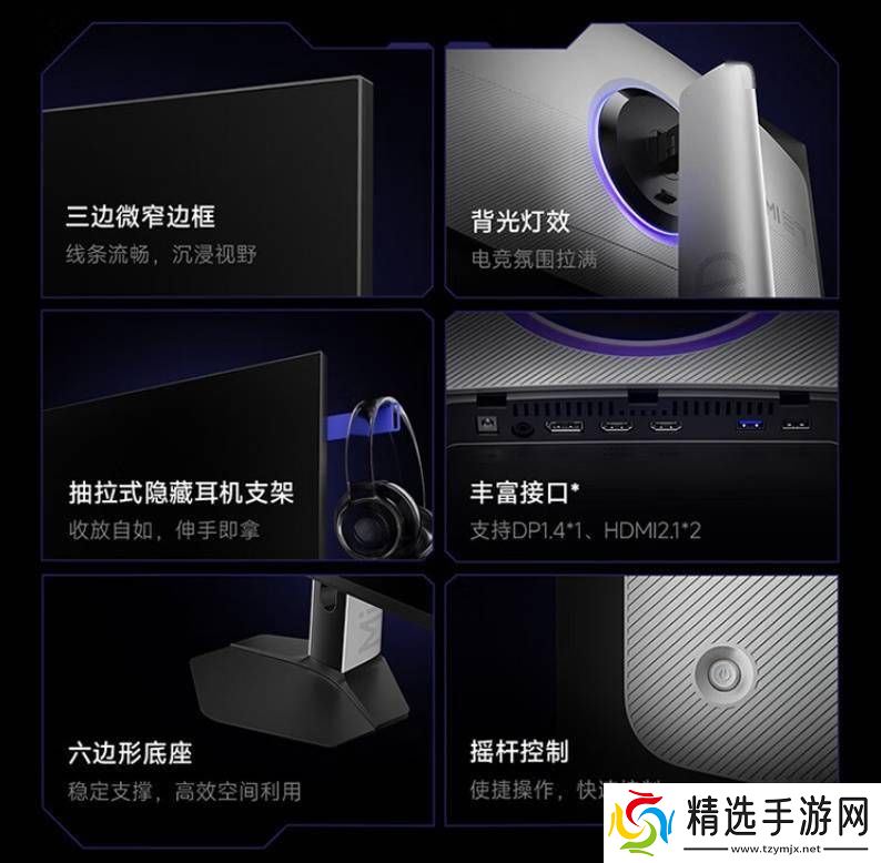 在外观设计方面,Redmi G Pro 27U采用了三边微窄边框设计,后置背光灯效,整体外观时尚简约。它还配备了抽拉式隐藏耳机支架,方便用户收纳耳机。同时,该显示器还提供了DP1.4和HDMI2.1接口,方便用户连接各种设备。它还采用了六边形底座设计,并支持摇杆控制,让用户在使用时更加便捷。