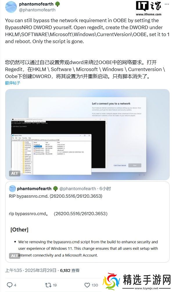 该绕过命令已在最新 Dev 及 Beta 测试版中失效,预计微软会在未来数周内将其推广至正式版本。