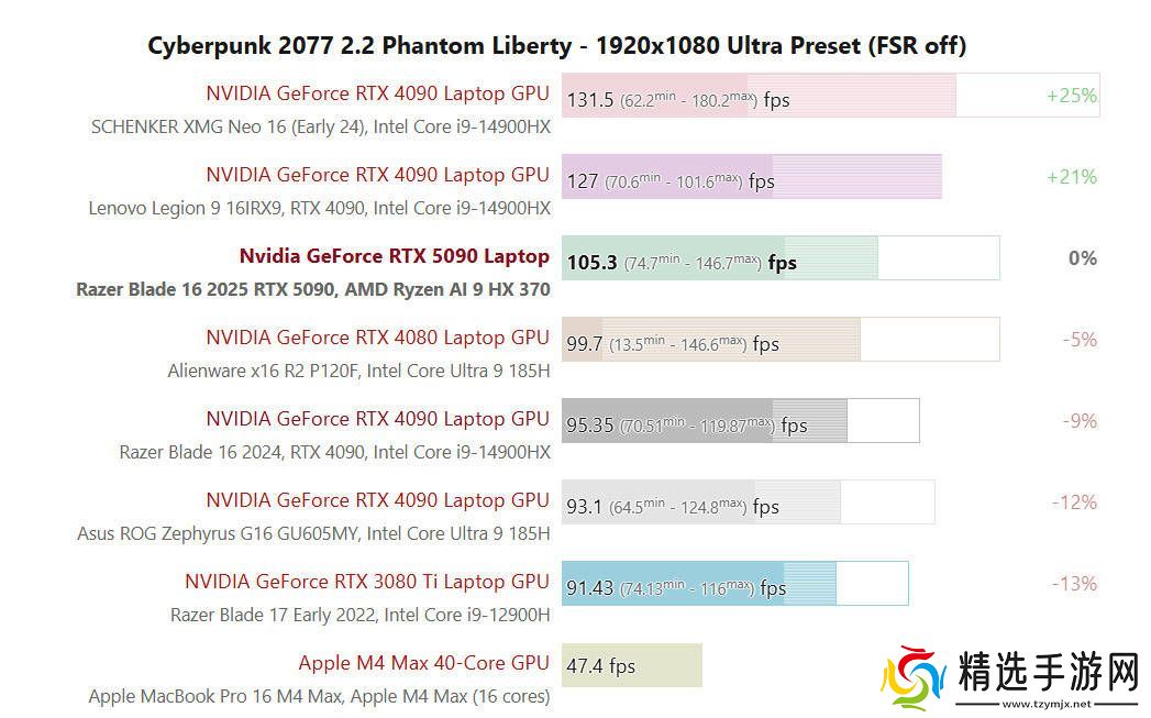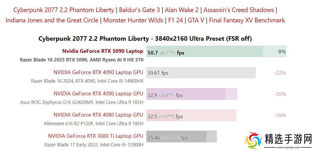 在游戏测试方面,notebookcheck选择了多款3A游戏进行测试,包括《赛博朋克2077》、《博德之门3》、《心灵杀手2》和《怪物猎人:世界》等。由于AI 9 HX 370 CPU的TDP仅为28W,且性能释放不如传统游戏本,因此在1080P分辨率下,雷蛇灵刃16 2025的表现不及搭载i9-14900HX+RTX 5090的传统游戏本。然而,当分辨率提高至2K或4K时,由于游戏压力更多地转移到了GPU上,雷蛇灵刃16 2025的表现与搭载i9-14900HX+RTX 5090的机型持平甚至超越。