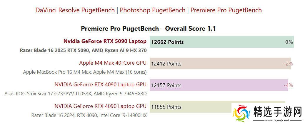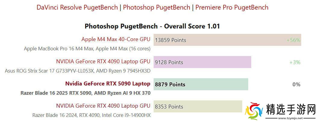 在PugetBench的专业软件测试中,雷蛇灵刃16 2025在Photoshop和Premiere Pro项目中并未展现出明显优势。然而,在达芬奇项目中,它相较于RTX 4090机型领先了约10%。