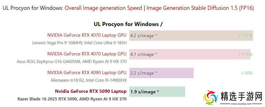 在UL Procyon的AI基准测试中,雷蛇灵刃16 2025在Image Generation项目中表现出色,相较于RTX 4090 Laptop GPU机型领先了约15%。