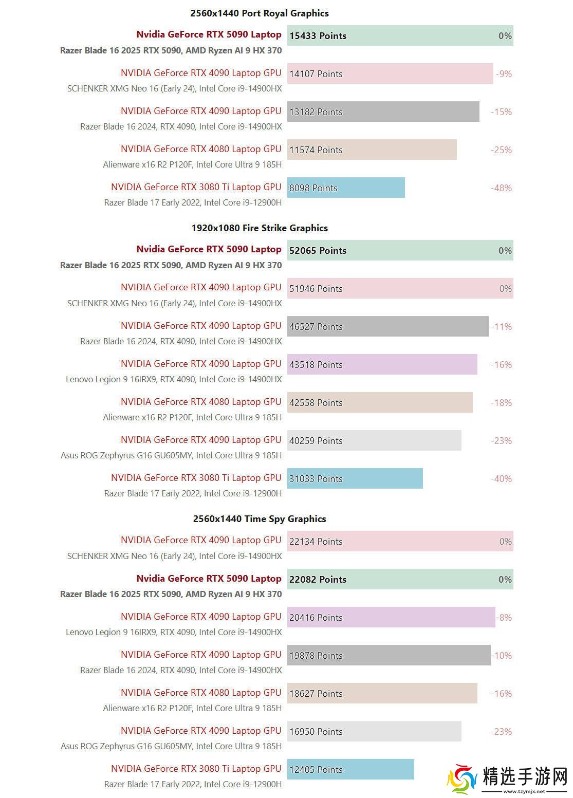 在3DMARK基准测试中,雷蛇灵刃16 2025的RTX 5090 Laptop GPU展现了出色的光追性能,在Port Royal项目中超越了RTX 4090 Laptop GPU约10%。而在代表DX11性能的Fire Strike和DX12性能的Time Spy项目中,它与RTX 4090 Laptop GPU的表现相当。