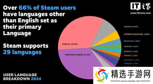 据Steam的详细统计显示,一个令人惊讶的事实浮出水面——超过66%的Steam用户选择了英语以外的语言作为他们的首选语言。而在这些非英语语言中,简体中文以33.7%的占比傲视群雄,略微超过了英语的33.5%,占据了榜首位置。还有1%的用户偏爱粤语,显示了语言多样性的独特魅力。