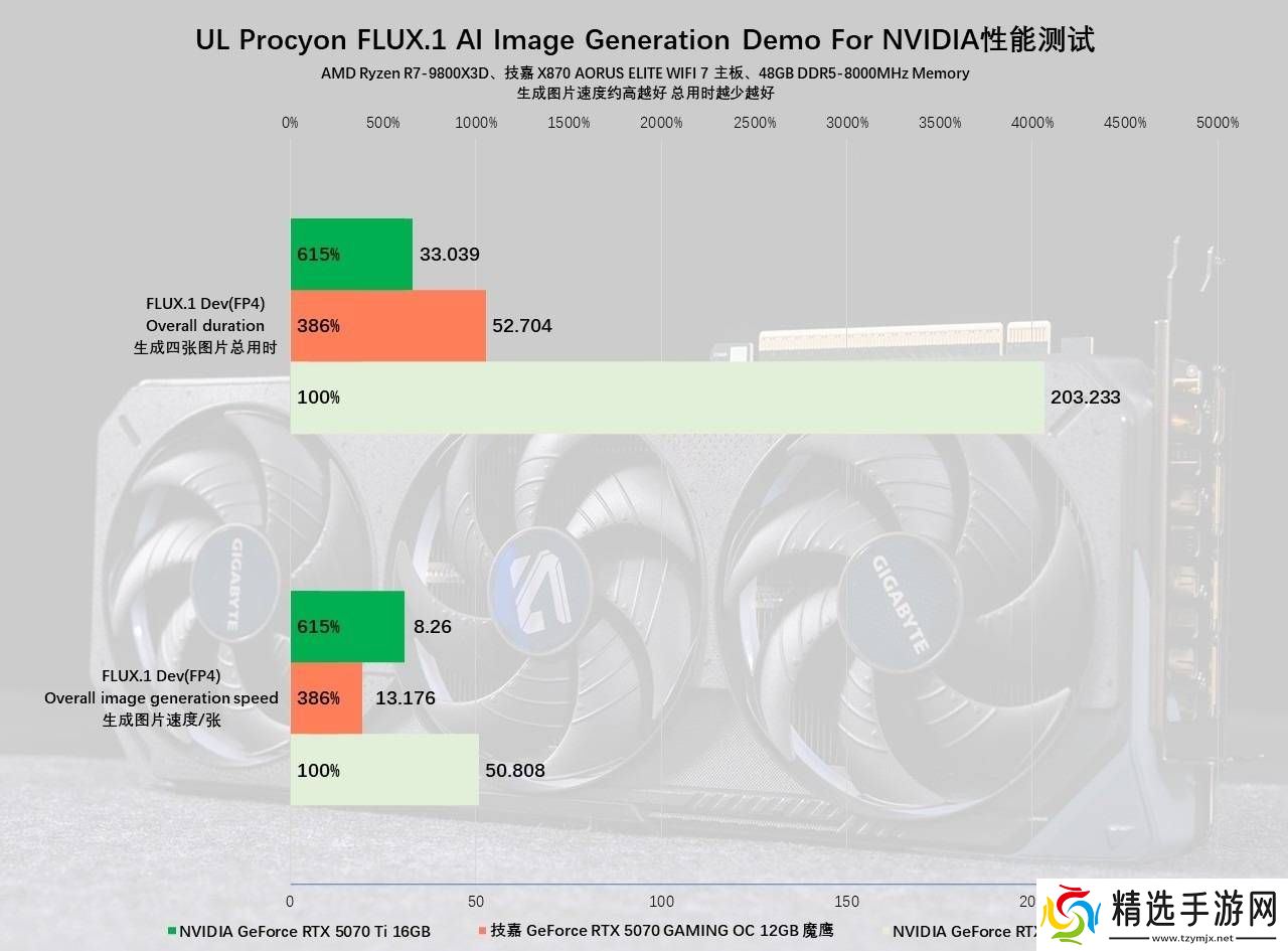 在AI性能方面,技嘉GeForce RTX 5070 GAMING OC 12G魔鹰同样表现出色。其支持FP4精度模型加速处理,相比FP8精度能够实现更快的生成速度和更低的显存占用。在UL Procyon的AI Image Generation Demo测试中,其生成速度相比RTX 4070有显著提升。