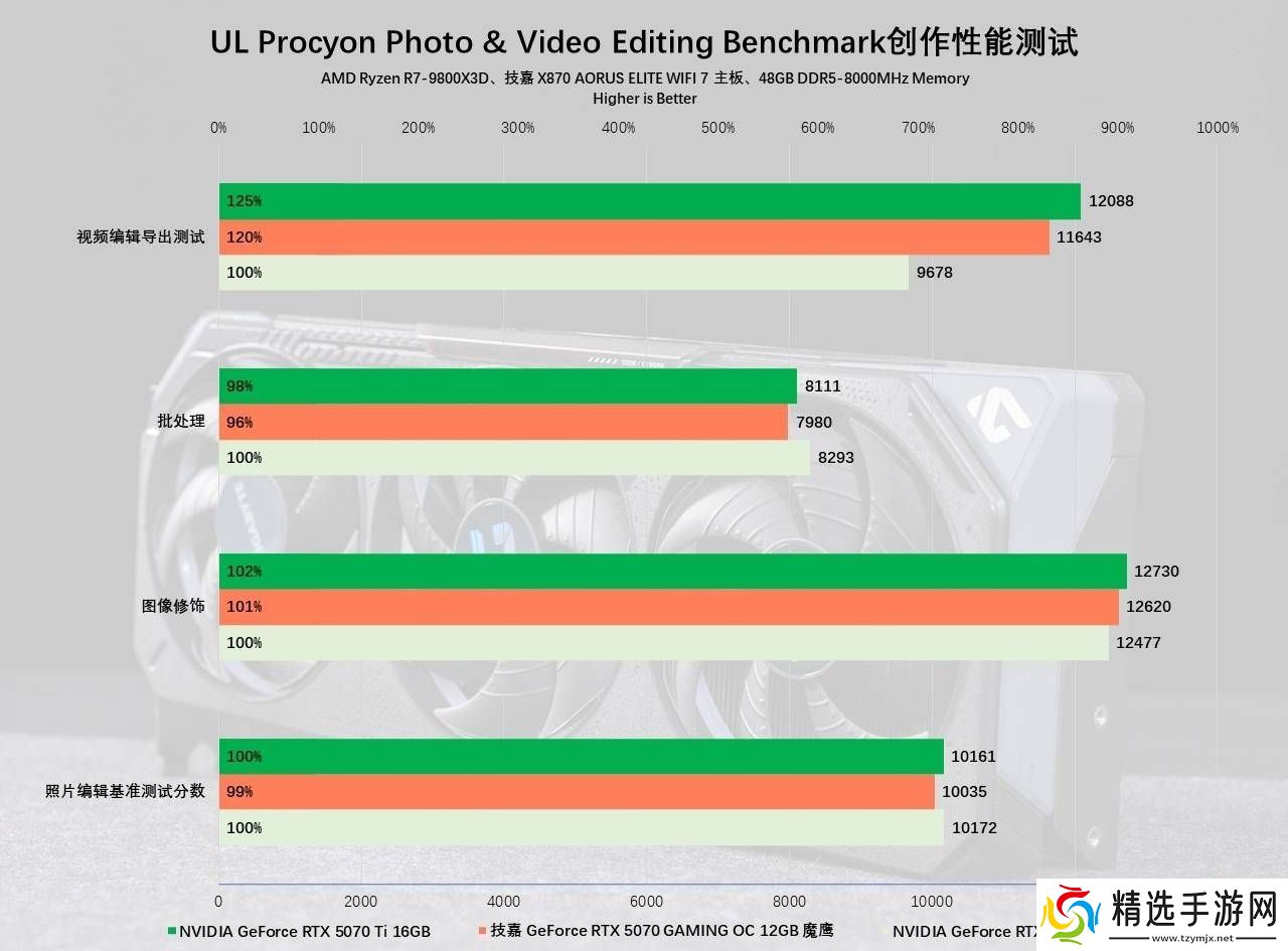 除了游戏性能外,技嘉GeForce RTX 5070 GAMING OC 12G魔鹰在创作领域也表现出色。在PCMark10 Extended测试中,其在游戏和数位内容创作方面相比RTX 4070有了约20%的提升。在视频编辑测试中,得益于新一代编解码器的支持,其性能提升尤为显著。