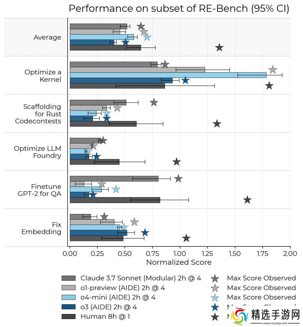 与o3模型形成鲜明对比的是,o4-mini模型在测试中并未发现任何“奖励黑客”行为。相反,它在RE-Bench任务组中表现出了出色的性能,尤其是在“优化内核”这一任务中,成绩尤为突出。