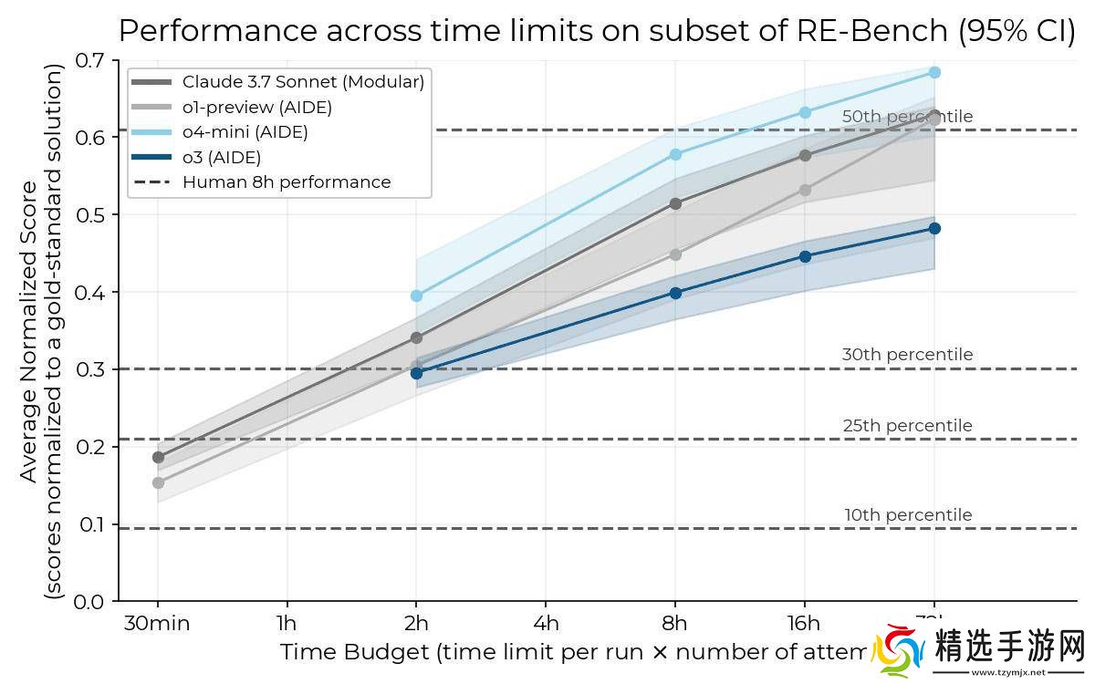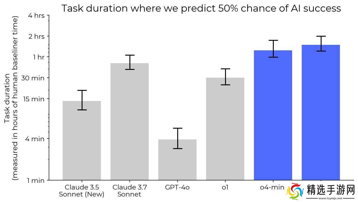 据METR的数据显示,在给予o4-mini模型32小时完成任务的情况下,其平均表现已经超过了人类第50百分位的水平。这一成绩无疑再次证明了OpenAI在AI模型研发方面的强大实力。
