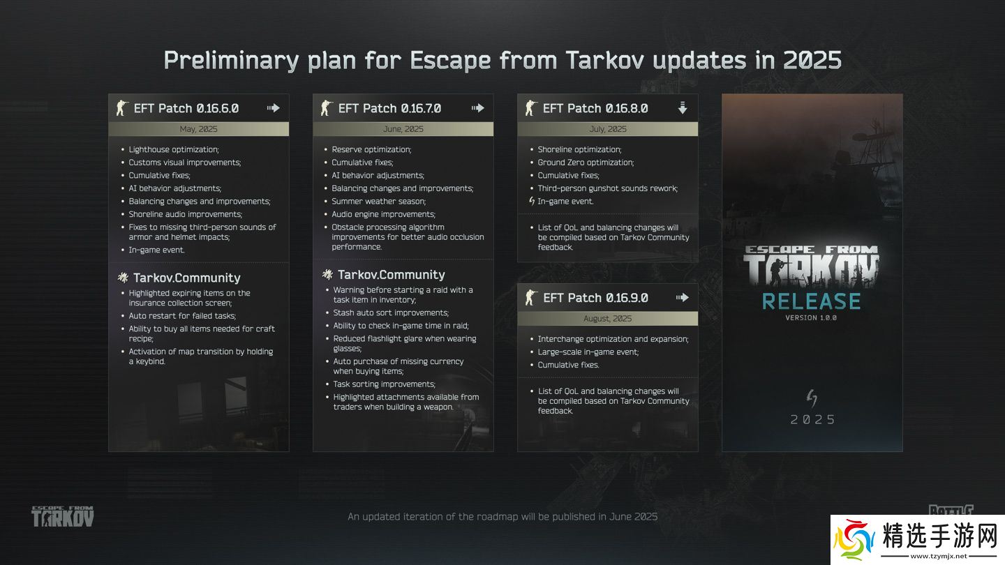 路线图显示《逃离塔科夫》最后一次测试版本更新计划于 8 月实施,意味着正式版最快 9 月上线(官方承诺会在 6 月公布正式版发售时间)。