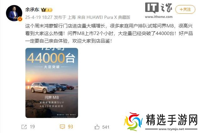 本站 4 月 19 日消息,华为常务董事、终端 BG 董事长余承东刚刚发文,宣布问界 M8 上市 72 个小时大定突破 4.4 万台。除此之外,享界 S9 增程版上市 72 小时大定破 5200 台。