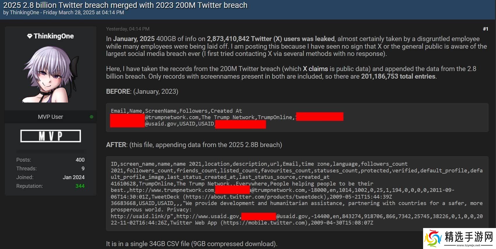 本站 3 月 31 日消息,据外媒 HACKREAD 报道,数据泄露论坛 Breach Forums“知名”用户 ThinkingOne 当地时间 28 日表示,X 社交平台于今年 1 月发生了一起异常严重的数据安全事件:存储了 28 亿 7341 万 842 条账户个人数据信息的 400GB 数据遭遇泄露。