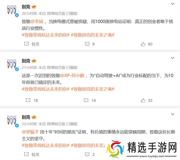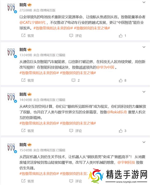 近期,别克汽车在其官方微博上向多位国内知名企业家及企业表达了敬意,这份名单中包括了王石、俞敏洪、罗振宇、蔚来汽车的李斌、小鹏汽车的何小鹏,以及宁德时代、华为中国、大疆和宇树科技等科技巨头。
