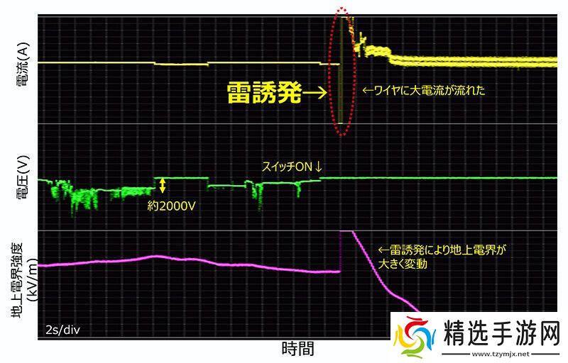 结果证实,大量电流流过导线,同时环境电场强度发生了显著变化(图 3)。此外,该实验还证实就在闪电感应之前,导线和地面之间产生了超过 2000 V 的电压,无人机周围电场强度的突然变化诱发了无人机上的闪电。这是世界上首次利用无人机成功触发闪电的尝试。