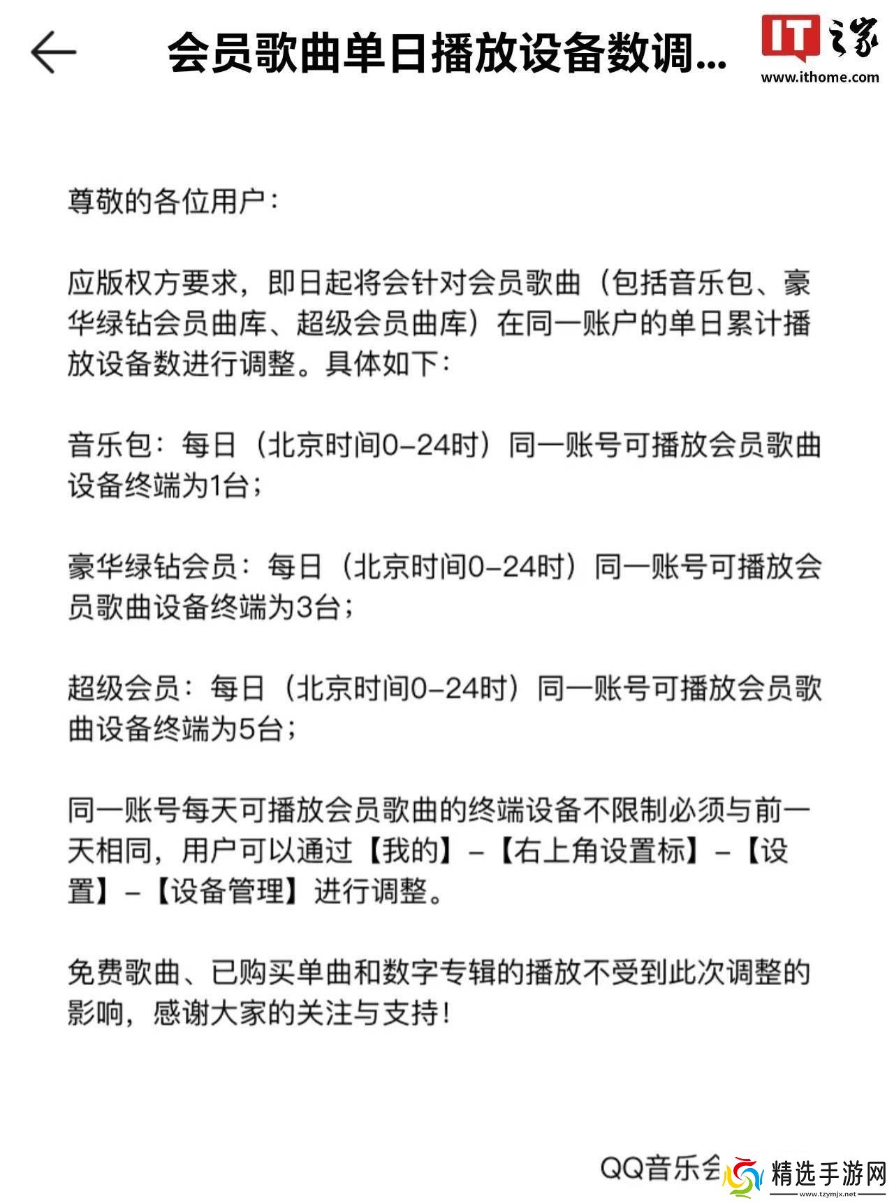 腾讯QQ音乐近日对会员歌曲的播放设备数量进行了调整,以满足版权方的要求。此次调整涉及音乐包、豪华绿钻会员以及超级会员的曲库。