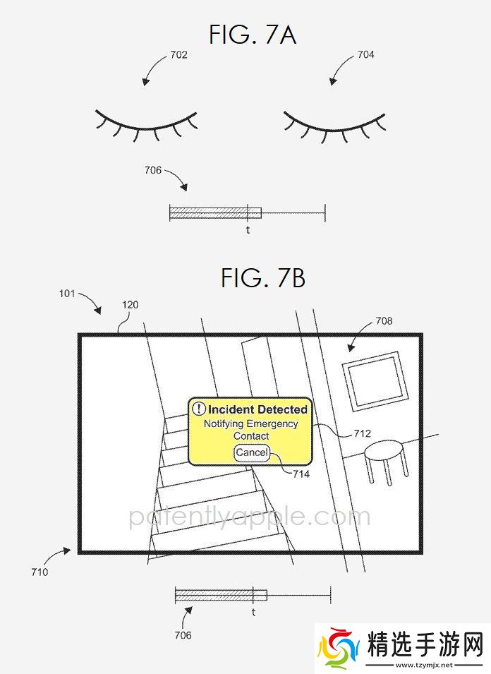 最新专利文件显示,系统将适配 Vision Pro 等穿戴设备,通过头显内置传感器实时监测用户眼部状态(如图 7A 所示)。当检测到眼皮覆盖眼球超 51%-100% 达设定时长(如 30 秒),或伴随血压骤降等生物特征异常时,即判定为意识丧失。
