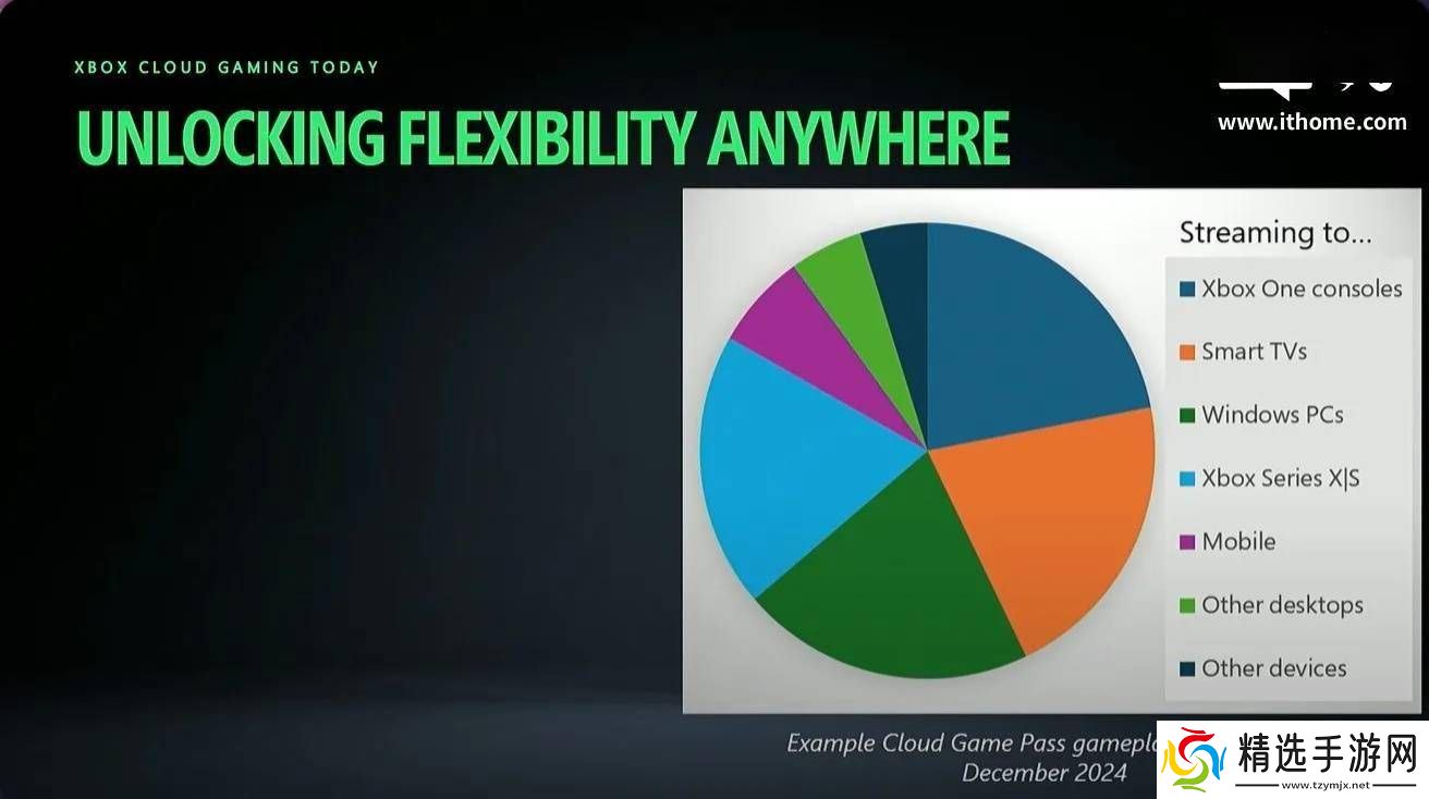 为了更直观地展示云游戏的普及程度,微软在 YouTube 上发布了一段 GDC(游戏开发者大会)的会议内容,其中详细展示了2024年12月期间,使用 Xbox 云游戏服务最多的平台分布。令人意外的是,Xbox One 以21.9%的使用率高居榜首,智能电视和 PC 分别以21.1%和20.8%的使用率紧随其后,而新一代主机 Xbox Series X|S 的使用率则为19.4%,移动设备的使用率为6.7%,其余设备占比相对较小。