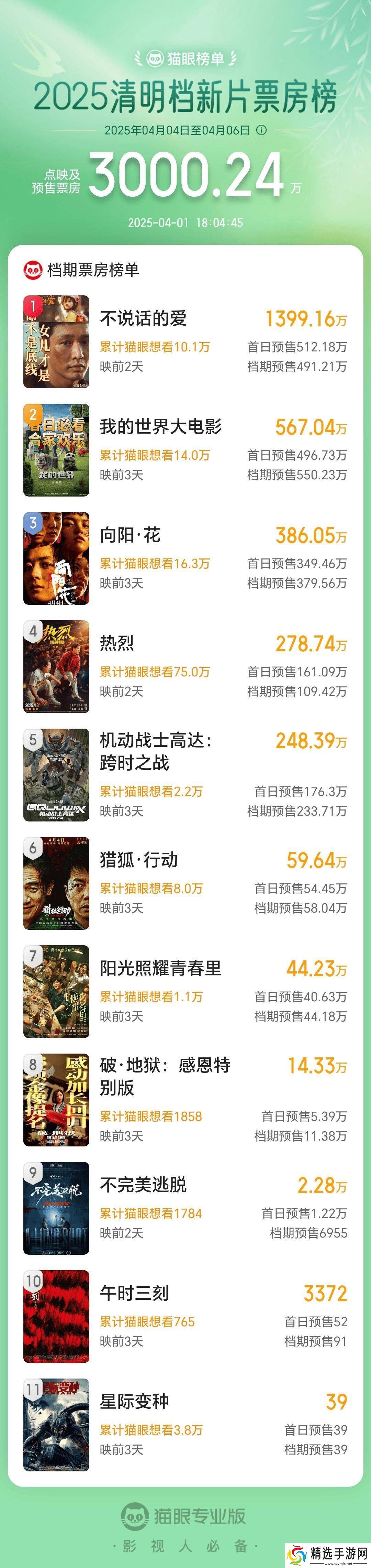 在众多新片中,三部影片脱颖而出,占据了票房榜的前三甲。其中,《不说话的爱》以深情细腻的叙事和真挚动人的情感,赢得了观众的广泛好评,预售票房高达1399.16万元,领跑整个清明档。紧随其后的是《我的世界大电影》,这部改编自全球知名游戏的电影,凭借其独特的视觉效果和丰富的故事情节,吸引了大量游戏迷和电影爱好者的关注,预售票房达到了567.04万元。
