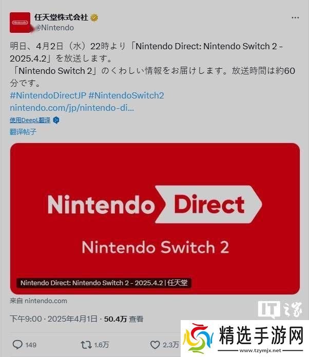 任天堂即将揭晓Switch 2的神秘面纱,一场备受期待的直面会定于北美东部夏令时间4月2日早上9点举行,换算至北京时间则为4月2日晚上9点。这场直面会预计将持续整整60分钟,为粉丝们带来一场视觉与信息的盛宴。