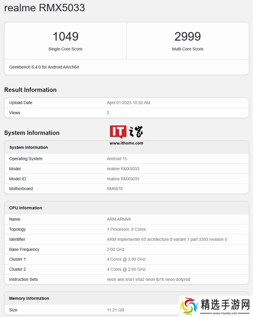 本站 4 月 2 日消息,科技媒体 xpertpick 昨日(4 月 1 日)发布博文,报道称 realme 真我 Narzo 80 Pro 手机(型号 RMX5033)现身 Geekbench 跑分平台,确认搭载联发科天玑 7400 芯片,单核 / 多核得分分别为 1049/2999,配备 12GB 内存与安卓15 系统。