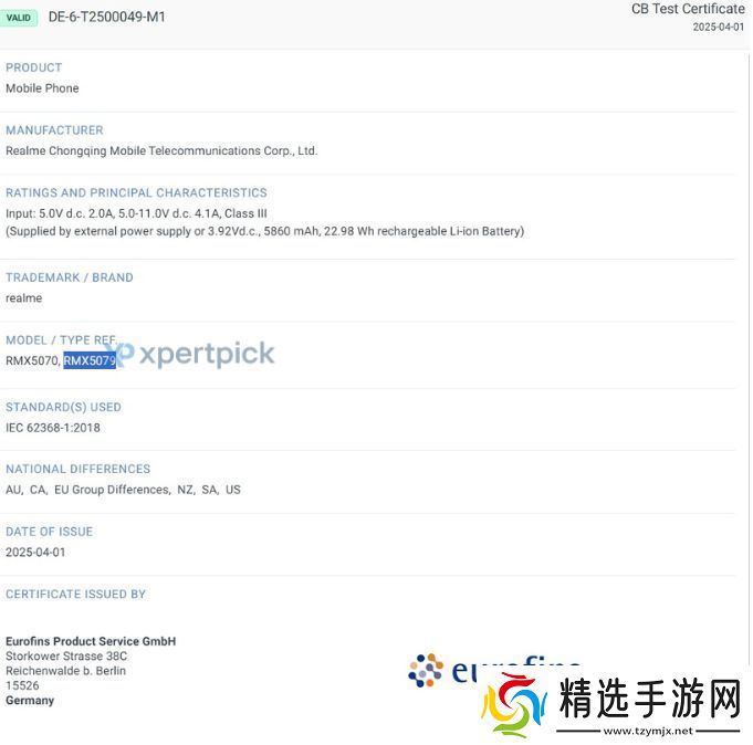 本站援引博文介绍,realme 真我 14T 5G(RMX5079)也通过 Eurofins 认证,配备 6000mAh 容量电池。此前消息称该机将采用 6.67 英寸 120Hz AMOLED 屏,搭载 Dimensity 6300 芯片,支持 45W 快充,后置 5000 万像素双摄,并具备 IP69 级防尘防水。预计本月底登陆全球市场。