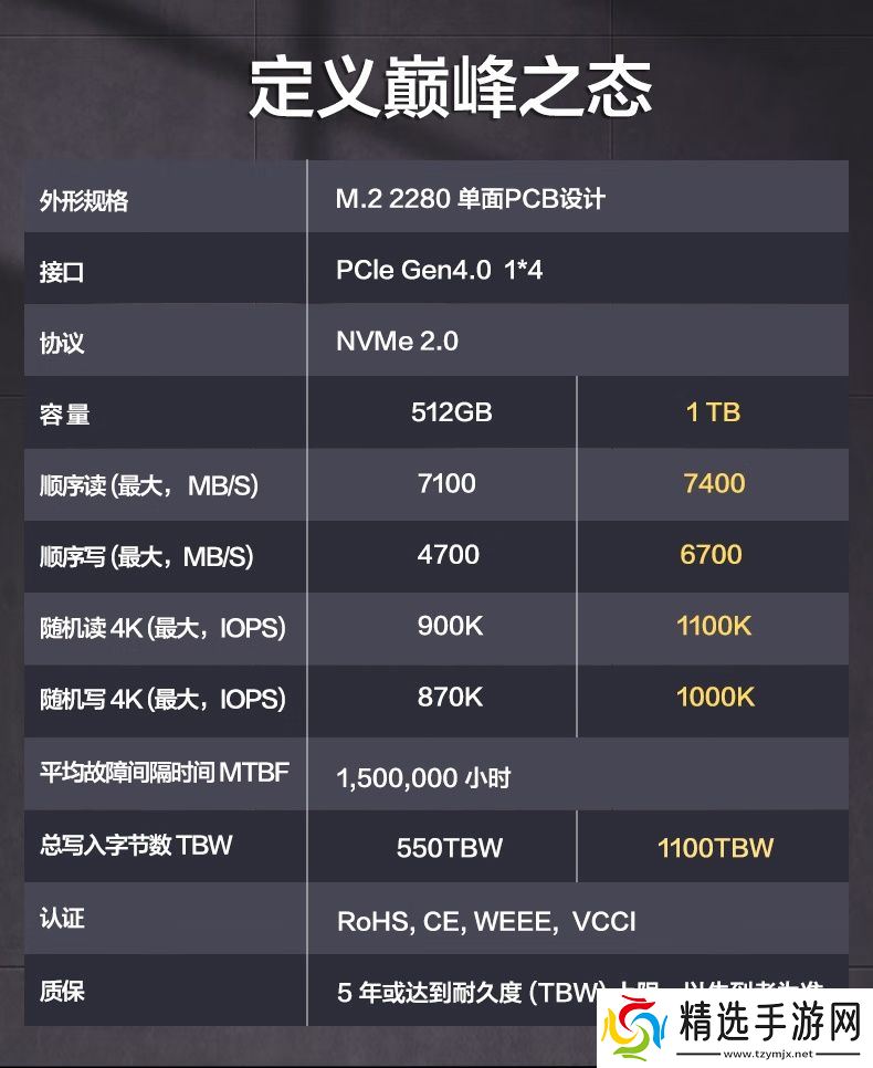 其顺序读取速度为 7400MB/s,顺序写入速度 6700MB/s,随机读取速度为 1100K,随机写入速度 1000K,平均故障间隔时间为 150 万小时,提供五年质保或 1100TBW 质保。