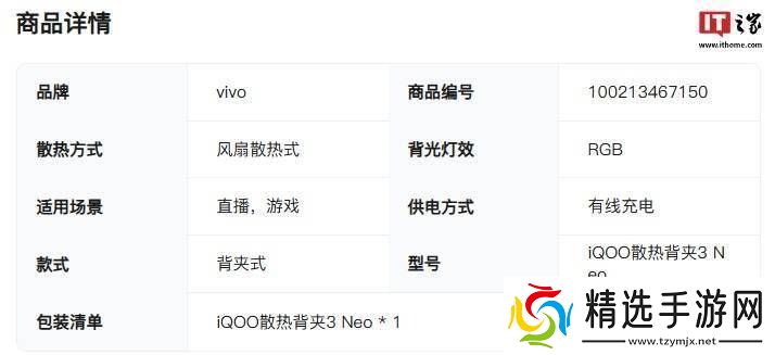 进一步了解发现,iQOO散热背夹3 Neo通过有线充电方式供电,并配备了炫酷的RGB背光灯效,为用户的使用体验增添了一份科技感。