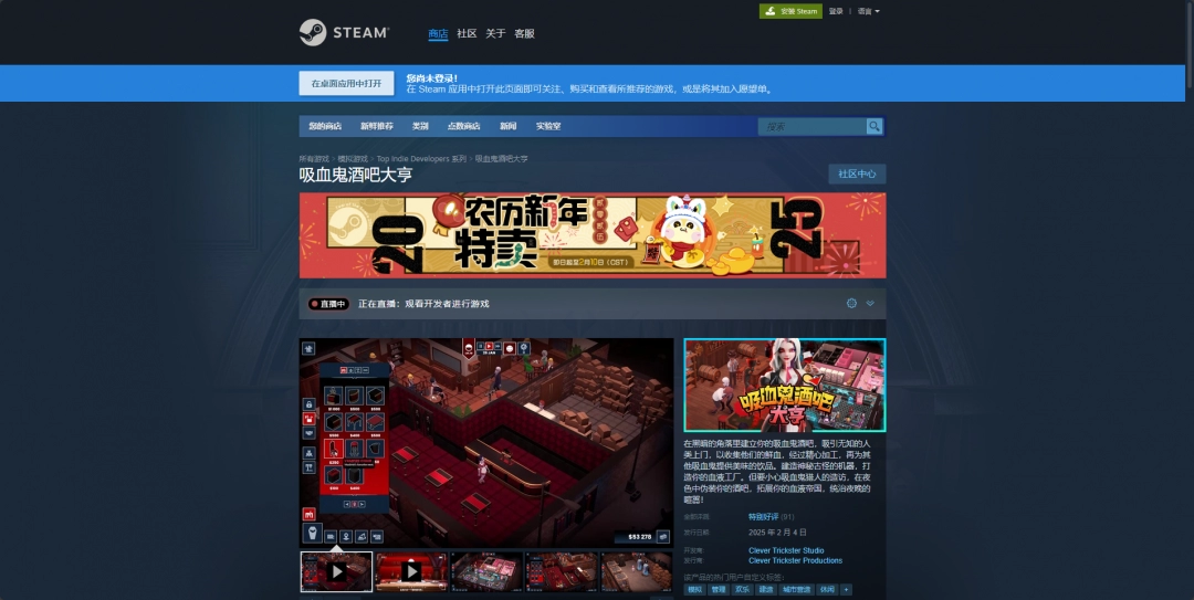 Steam平台需要先安装Steam平台,之后注册一个账号登录,然后搜索“吸血鬼酒吧大亨”进入商店购买页面。
