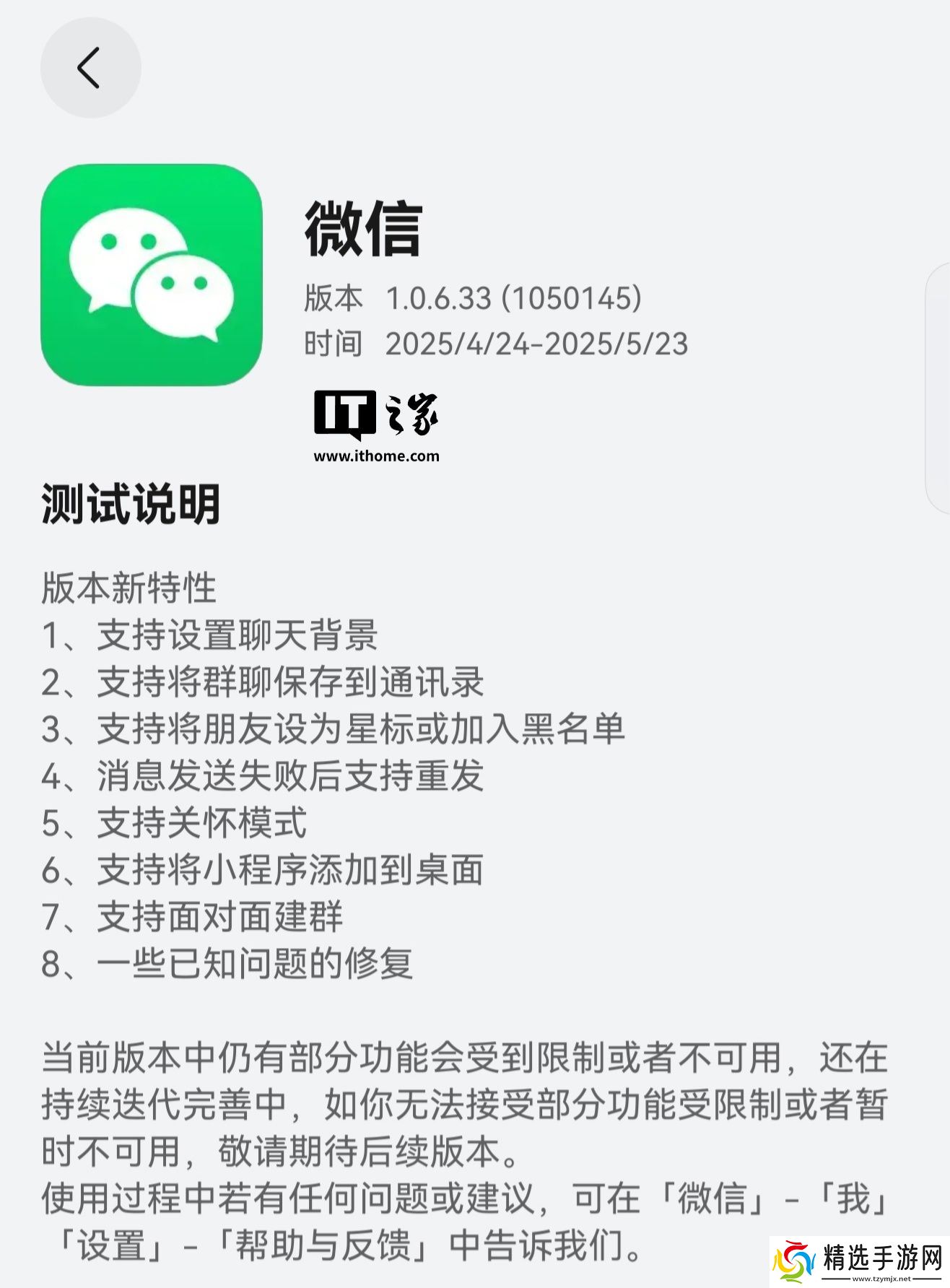 本站 4 月 24 日消息,微信鸿蒙版 App 今日在华为应用市场(App Gallery)开启1.0.6.33(1050145)版本邀测升级(需收到短信通知后点击链接跳转安装,未收到短信需继续等待),测试时间为 2025/4/24 - 2025/5/23。这也是微信本周发布的第四次邀测升级。