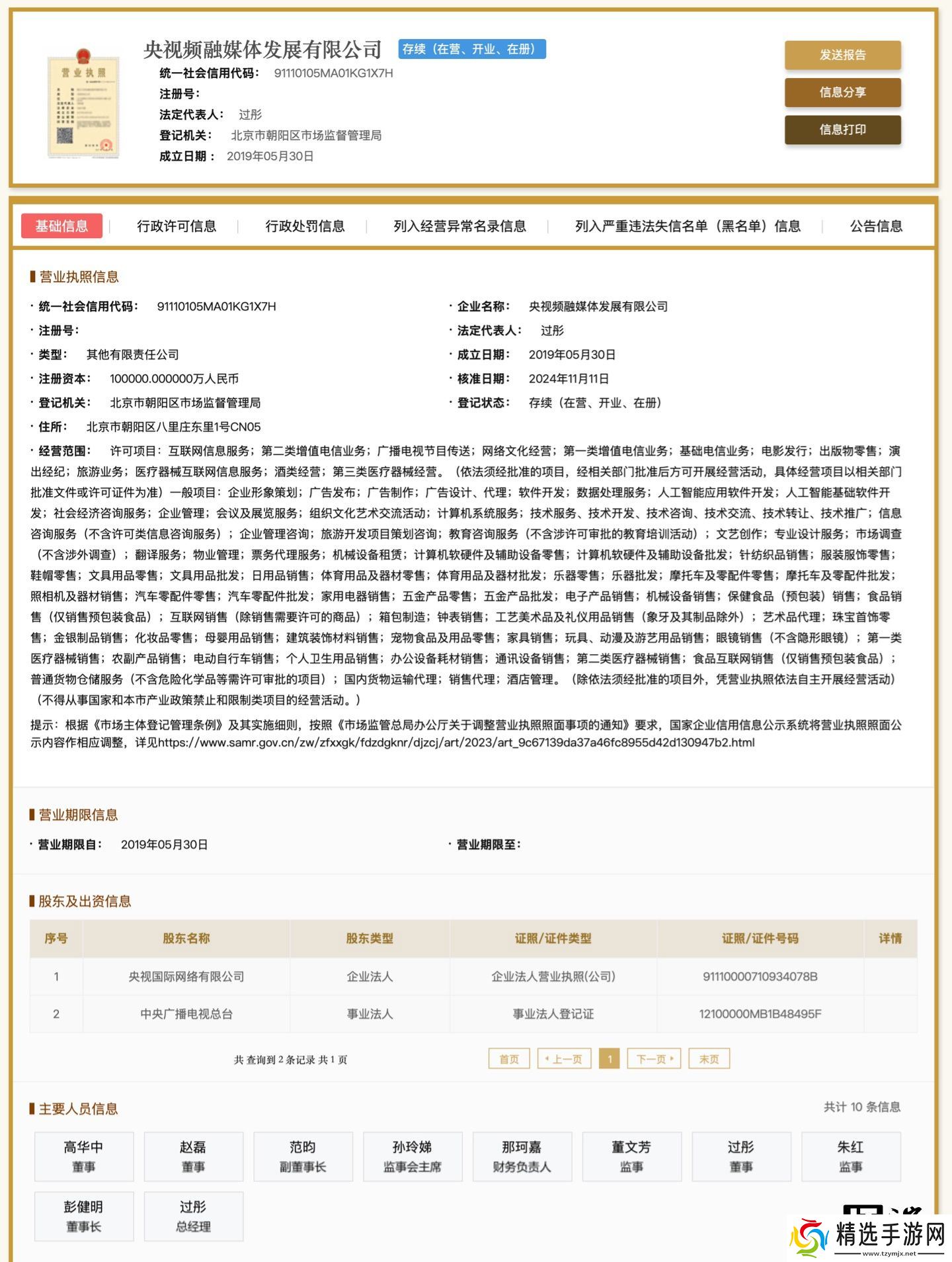 本站注意到,央视频融媒体发展有限公司由中央广播电视总台持股 90%,央视国际网络有限公司持股 10%。