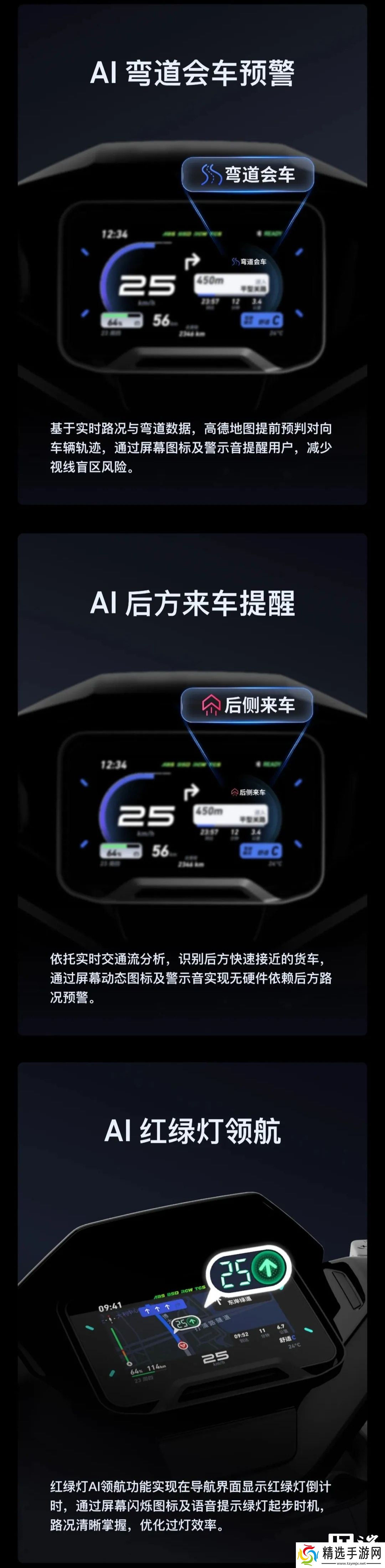 AI 弯道会车预警:基于实时路况与弯道数据,高德地图提前预判对向车辆轨迹,通过屏幕图标及警示音提醒用户,减少视线盲区风险。
