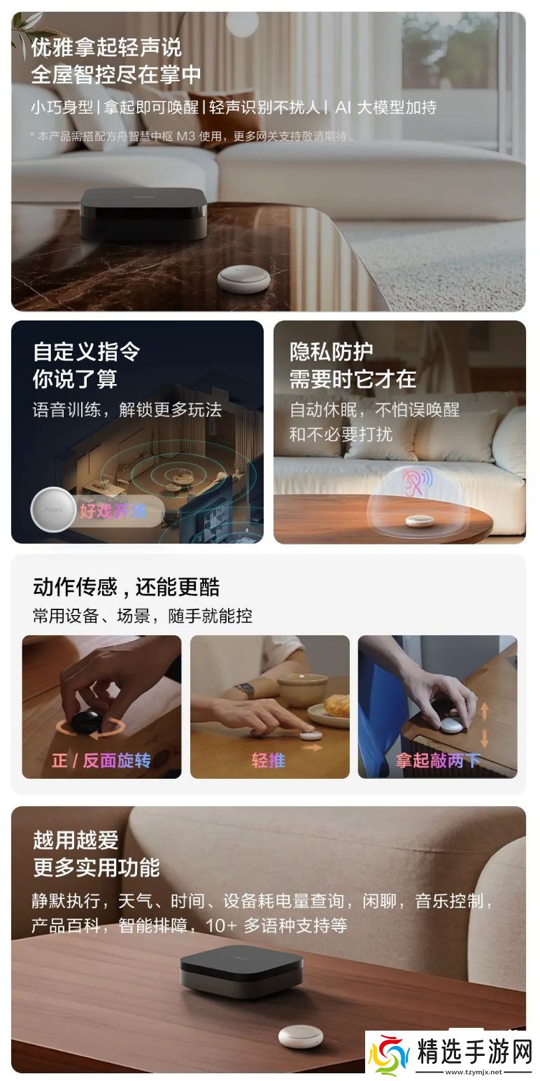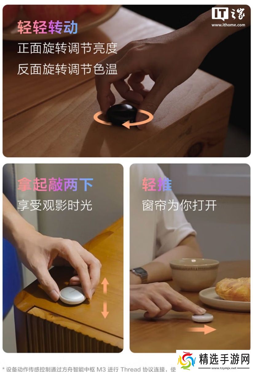 Aqara 智能语音伴侣 H1 还内置六轴传感器,可感应设备姿态和动作,用户可以通过转动、敲击、轻推等动作来进行自定义操控。