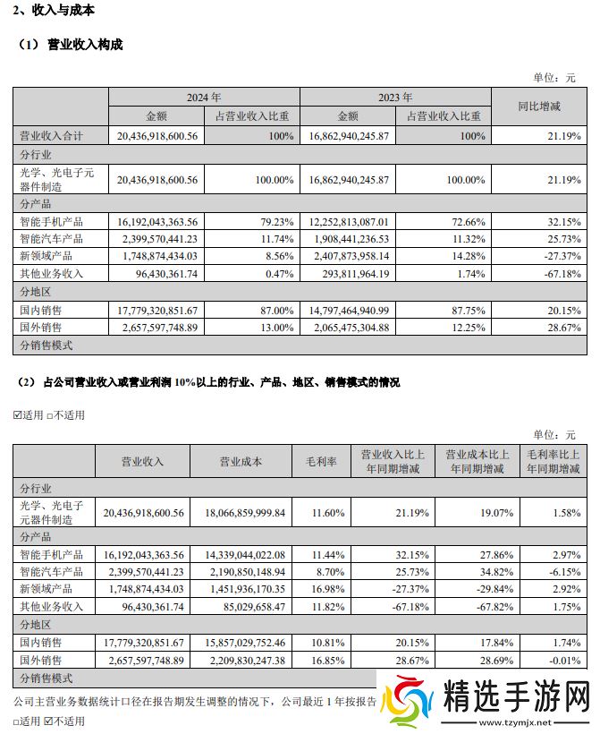 本站 4 月 1 日消息,欧菲光今晚发布公告,2024 年营业收入 204.37 亿元,同比增长 21.19%。