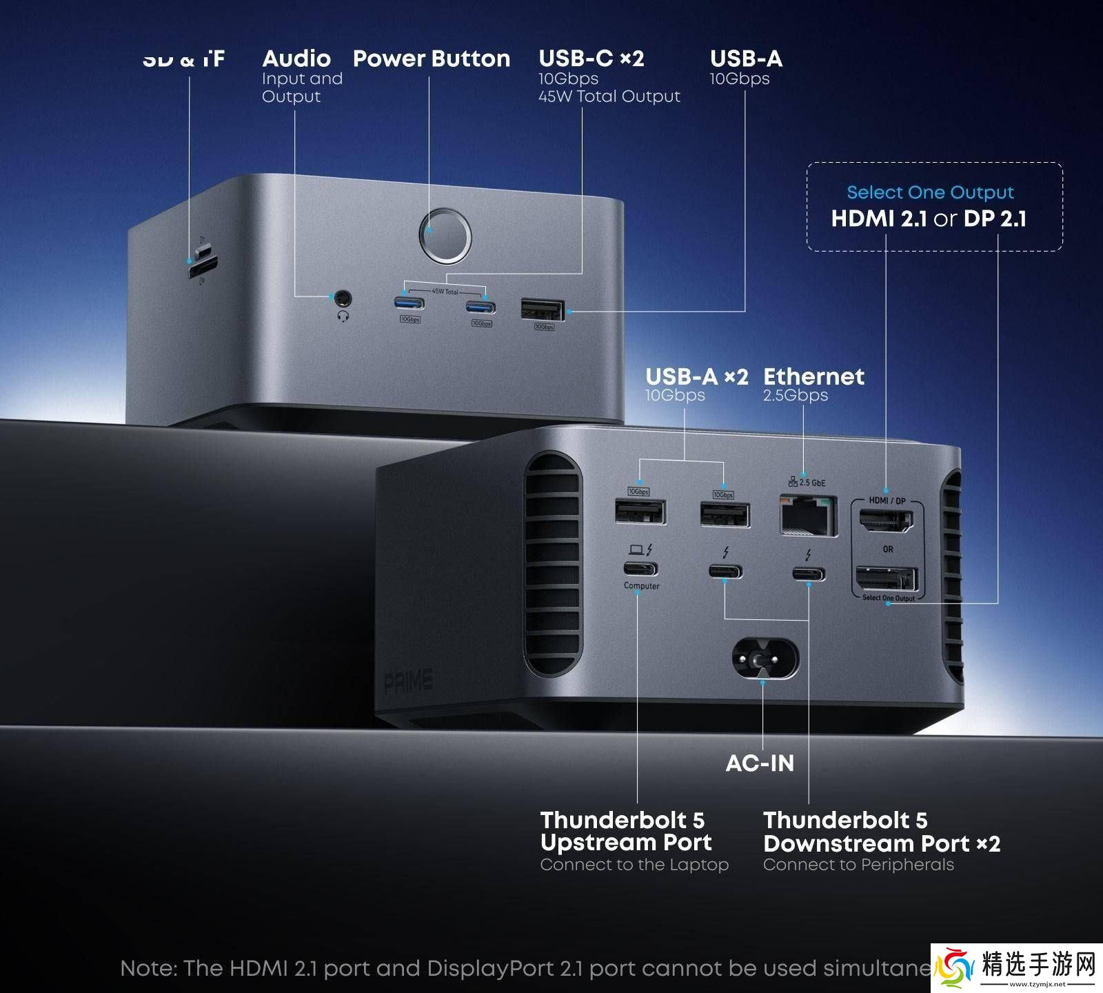 这款Prime TB5扩展坞集成了十四种接口,特别采用了内置AC电源适配器设计,省去了额外携带电源适配器的麻烦。其接口布局科学合理: